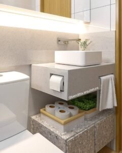 A bancada em porcelanato, por possuir baixa absorção e permitir higienização simples no uso cotidiano, contribui diretamente para um ambiente visualmente limpo e mais fácil de manter.